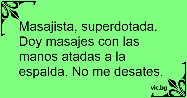 Masajista, superdotada. Doy masajes соn las manos atadas a la espalda. No me desates.
