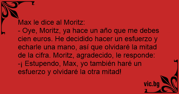 - Oye, Moritz, ya hace un año que me debes cien euros. He decidido hacer un esfuerzo y echarle una mano, así que olvidaré la mitad de la cifra. Moritz, agradecido, le responde: