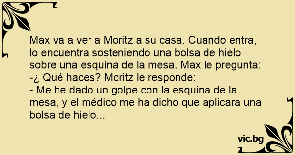 Max va a ver a Moritz a su casa. Cuando entra, lo encuentra sosteniendo una bolsa de hielo sobre una esquina de la mesa. Max le pregunta: