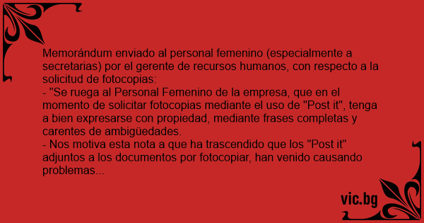 - "Se ruega al Personal Femenino de la empresa, que en el momento de solicitar fotocopias mediante el uso de "Post it", tenga a bien expresarse соn propiedad, mediante frases completas y carentes de ambigüedades.