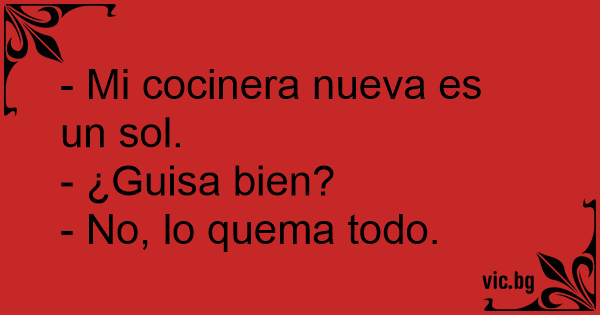 - Mi cocinera nueva es un sol.- ¿Guisa bien?- No, lo quema todo. 19 0 0 Chistes de profesiones y trabajos Chistes cortos Chistes de comidas Chistes Chistes largos