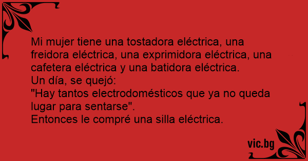 Mi mujer tiene una tostadora eléctrica, una freidora eléctrica, una exprimidora eléctrica, una cafetera eléctrica y una batidora eléctrica.