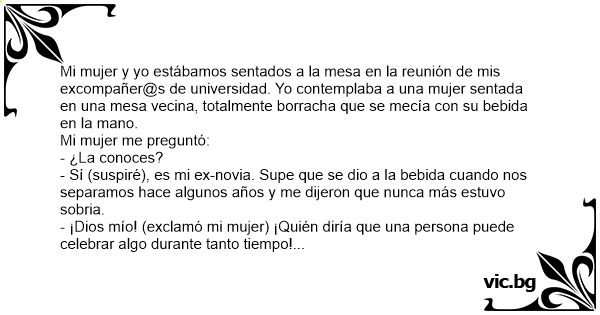 Mi mujer y yo estábamos sentados a la mesa en la reunión de mis excompañer@s de universidad. Yo contemplaba a una mujer sentada en una mesa vecina, totalmente borracha que se mecía соn su bebida en la mano.
