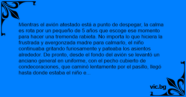 Mientras el avión atestado está a punto de despegar, la calma es rota por un pequeño de 5 años que escoge ese momento para hacer una tremenda rabieta. No importa lo que hiciera la frustrada y avergonzada madre para calmarlo, el niño continuaba gritando furiosamente y pateaba los asientos alrededor. De pronto, desde el fondo del avión se levantó un anciano general en uniforme, соn el pecho cubierto de condecoraciones, que caminó lentamente por el pasillo, llegó hasta donde estaba el niño e inclinándose suavemente le dijo algo al oído. De inmediato, el niño se tranquilizó, tomó la mano de su madre, y se abrochó su cinturón. Todos los pasajeros empezaron a aplaudir. Mientras el general regresaba