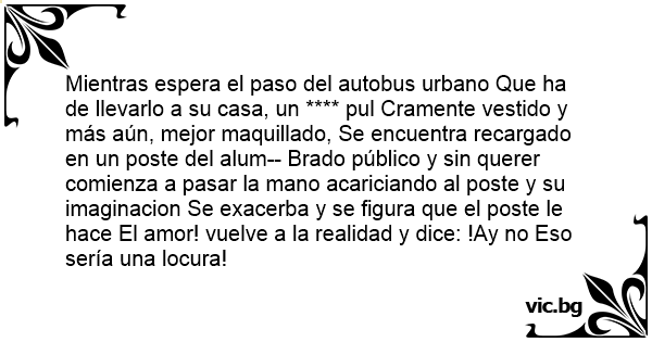 Mientras espera el paso del autobus urbano Que ha de llevarlo a su casa, un **** pul Cramente vestido y más aún, mejor maquillado, Se encuentra recargado en un poste del alum-- Brado público y sin querer comienza a pasar la mano acariciando al poste y su imaginacion Se exacerba y se figura que el poste le hace El amor! vuelve a la realidad y dice: !Ay no Eso sería una locura!