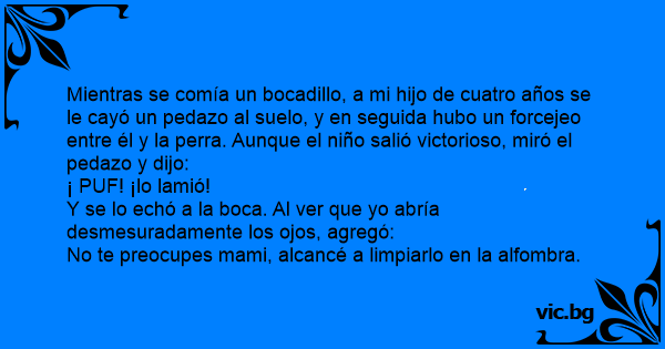 Mientras se comía un bocadillo, a mi hijo de cuatro años se le cayó un pedazo al suelo, y en seguida hubo un forcejeo entre él y la perra. Aunque el niño salió victorioso, miró el pedazo y dijo: