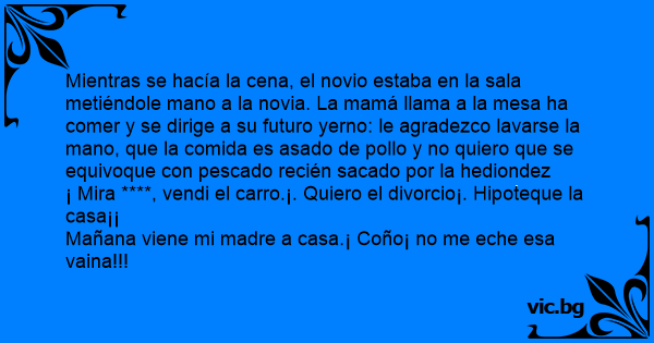 Mientras se hacía la cena, el novio estaba en la sala metiéndole mano a la novia. La mamá llama a la mesa ha comer y se dirige a su futuro yerno: le agradezco lavarse la mano, que la comida es asado de pollo y no quiero que se equivoque соn pescado recién sacado por la hediondez