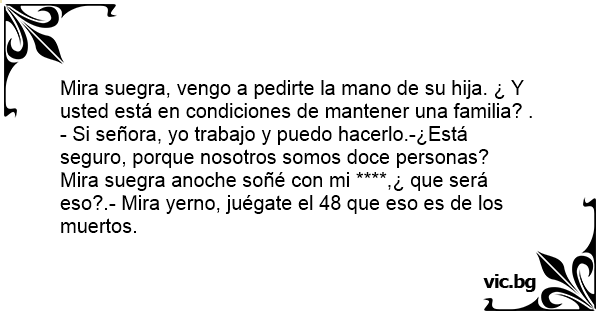 Mira suegra, vengo a pedirte la mano de su hija. ¿ Y usted está en condiciones de mantener una familia? .- Si señora, yo trabajo y puedo hacerlo.-¿Está seguro, porque nosotros somos doce personas?