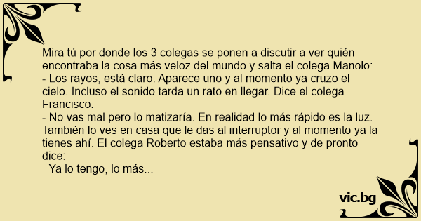 - No vas mal pero lo matizaría. En realidad lo más rápido es la luz. También lo ves en casa que le das al interruptor y al momento ya la tienes ahí. El colega Roberto estaba más pensativo y de pronto dice: