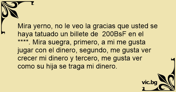 Mira yerno, no le veo la gracias que usted se haya tatuado un billete de 200BsF en el ****. Mira suegra, primero, a mi me gusta jugar соn el dinero, segundo, me gusta ver crecer mi dinero y tercero, me gusta ver como su hija se traga mi dinero.