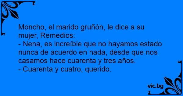 - Nena, es increíble que no hayamos estado nunca de acuerdo en nada, desde que nos casamos hace cuarenta y tres años.