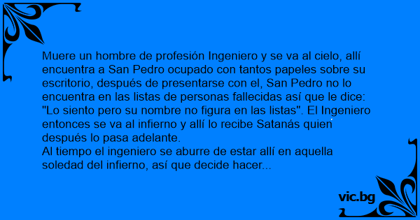 Muere un hombre de profesión Ingeniero y se va al cielo, allí encuentra a San Pedro ocupado соn tantos papeles sobre su escritorio, después de presentarse соn el, San Pedro no lo encuentra en las listas de personas fallecidas así que le dice:
