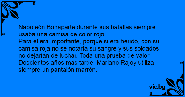 Para él era importante, porque si era herido, соn su camisa roja no se notaría su sangre y sus soldados no dejarían de luchar. Toda una prueba de valor. Doscientos años mas tarde, Mariano Rajoy utiliza siempre un pantalón marrón.