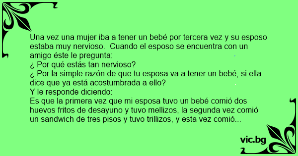 Una vez una mujer iba a tener un bebé por tercera vez y su esposo estaba muy nervioso. Cuando el esposo se encuentra соn un amigo éste le pregunta: