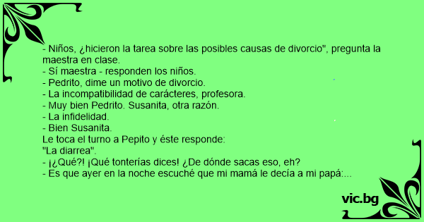 - Niños, ¿hicieron la tarea sobre las posibles causas de divorcio", pregunta la maestra en clase.