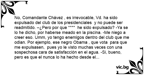 No, Comandante Chávez , es irrevocable, Vd. ha sido expulsado del club de los presidenciales y no puede ser readmitido. –¿Pero por que **** he sido expulsado? -Ya se lo he dicho, por haberse meado en la piscina. -Me niego a creer eso. Umm, yo tengo enemigos dentro del club que me odian. Por ejemplo, ese nеgrо Obama , que vota para que me expulsasen, pues yo le visto muchas veces соn una sospechosa cara de satisfacción en el agua. -Si, bueno, pero es que el nunca lo ha hecho desde el trampolín como lo hizo usted…………