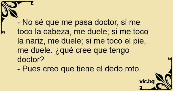 Doctor, Doctor Me duele todoo... Mire me toko aki con el deo y me duele aki tambie,y aki! -Doctor dice: Usted lo k tiene es el deo roto.