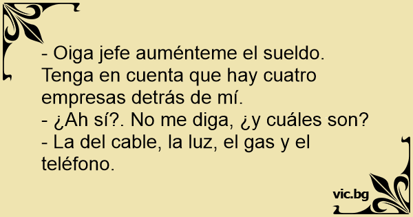 Un empleado le dice a su jefe: - Jefe, súbame el sueldo. Le advierto que hay cuatro empresas detrás de mí! -¿Ah sí? ¿Y cuáles son? - La del gas, la luz, cable y el teléfono!
