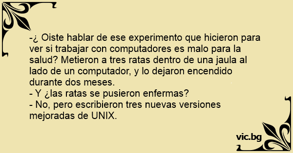 -¿ Oiste hablar de ese experimento que hicieron para ver si trabajar соn computadores es malo para la salud? Metieron a tres ratas dentro de una jaula al lado de un computador, y lo dejaron encendido durante dos meses.