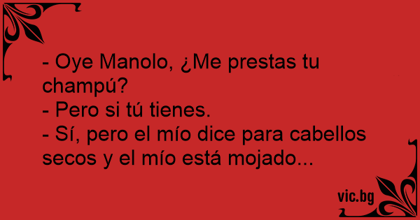 Después de un partido de tenis Manolo y Pepe se duchan en el club... - Manolo, ¿me puedex dar un poco de tu Champú? - Pero tú tienes el tuyo, ¿se te ha acabado? - No. Pero el mío dice "para cabello seco”, y yo lo tengo lodo mojado.