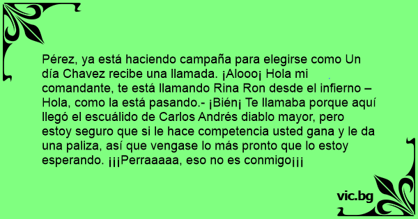 Pérez, ya está haciendo campaña para elegirse como Un día Chavez recibe una llamada. ¡Alooo¡ Hola mi comandante, te está llamando Rina Ron desde el infierno – Hola, como la está pasando.- ¡Bién¡ Te llamaba porque aquí llegó el escuálido de Carlos Andrés diablo mayor, pero estoy seguro que si le hace competencia usted gana y le da una paliza, así que vengase lo más pronto que lo estoy esperando. ¡¡¡Perraaaaa, eso no es conmigo¡¡¡