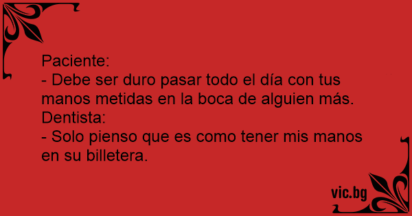 Un paciente hablando con su dentista, pregunta: - Debe ser duro pasar todo el día con tus manos metidas en la boca de alguien más. - No lo crea, tengo una técnica que me permite hacerlo. - Y cuál...