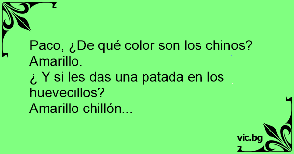 ¿ De que color es un chino si le agarras de los ****? Amarillo chillon Jaajajaja xD