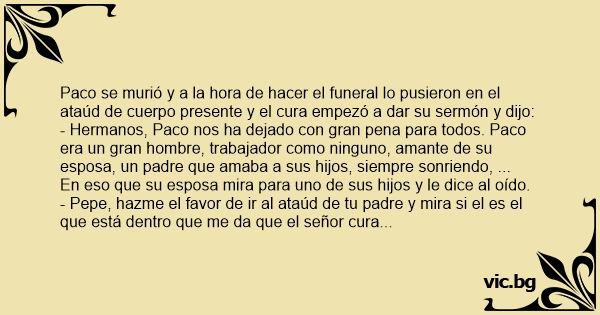 Paco se murió y a la hоrа de hacer el funeral lo pusieron en el ataúd de cuerpo presente y el cura empezó a dar su sermón y dijo:
