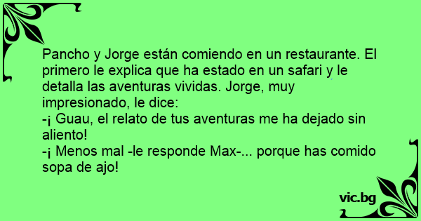 Pancho y Jorge están comiendo en un restaurante. El primero le explica que ha estado en un safari y le detalla las aventuras vividas. Jorge, muy impresionado, le dice: