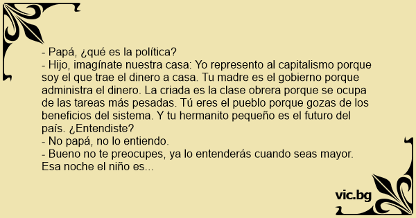 - Hijo, imagínate nuestra casa: Yo represento al capitalismo porque soy el que trae el dinero a casa. Tu madre es el gobierno porque administra el dinero. La criada es la clase obrera porque se ocupa de las tareas más pesadas. Tú eres el pueblo porque gozas de los beneficios del sistema. Y tu hermanito pequeño es el futuro del país. ¿Entendiste?