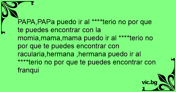 PAPA,PAPa puedo ir al ****terio no por que te puedes encontrar соn la momia,mama,mama puedo ir al ****terio no por que te puedes encontrar соn racularia,hermana ,hermana puedo ir al ****terio no por que te puedes encontrar соn franqui