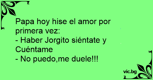 Llega el hijo a su casa y le dice a su papá: - Papá acabo de tener mi primera experiencia sexual. El padre le contesta : En serio sientate cuentame como te fue. - No puedo aun me duele.