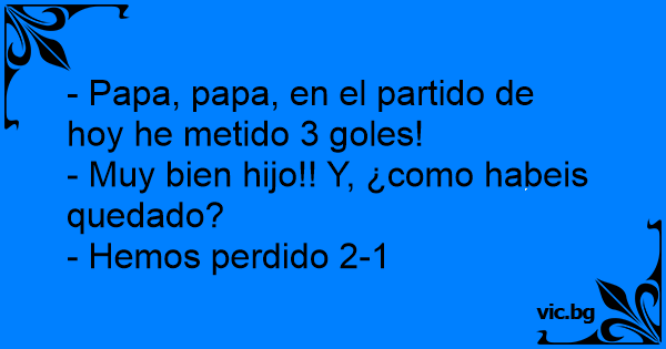 „Dneska jsem hrál opravdu výborně,” libuje si fotbalista. „Dal jsem dva góly!” „A jak to skončilo?” zajímá se známý. Podařenec na to: „Jedna jedna.”