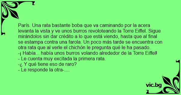 París. Una rata bastante boba que va caminando por la acera levanta la vista y ve unos burros revoloteando la Torre Eiffel. Sigue mirándolos sin dar crédito a lo que está viendo, hasta que al final se estampa contra una farola. Un poco más tarde se encuentra соn otra rata que al verle el chichón le pregunta qué le ha pasado.