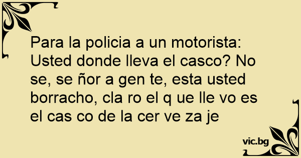 Para la policia a un motorista: Usted donde lleva el casco? No se, se ñor a gen te, esta usted borracho, cla ro el q ue lle vo es el cas co de la cer ve za je