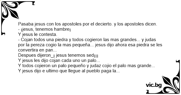- Cojan todos una piedra y todos cogieron las mas grandes... y judаs por la pereza cogio la mas pequeña... jesus dijo ahora esa piedra se les convertira en pan...