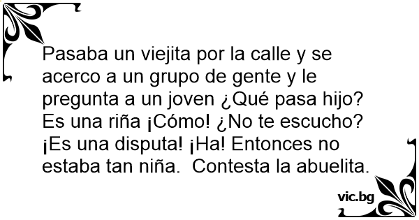 Pasaba un viejita por la calle y se acerco a un grupo de gente y le pregunta a un joven ¿Qué pasa hijo? Es una riña ¡Cómo! ¿No te escucho? ¡Es una disputa! ¡Ha! Entonces no estaba tan niña. Contesta la abuelita.