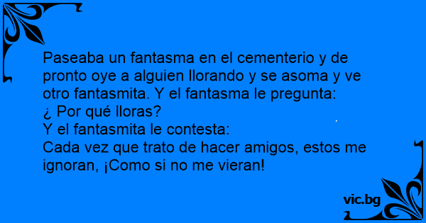Paseaba un fantasma en el cementerio y de pronto oye a alguien llorando y se asoma y ve otro fantasmita. Y el fantasma le pregunta:
