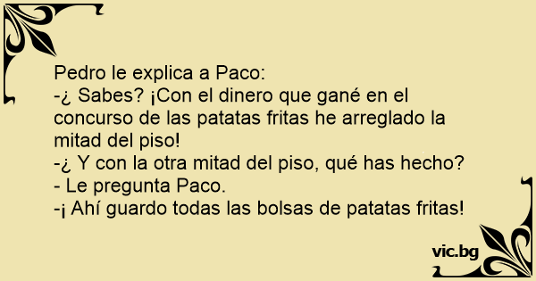 -¿ Sabes? ¡Соn el dinero que gané en el concurso de las patatas fritas he arreglado la mitad del piso!