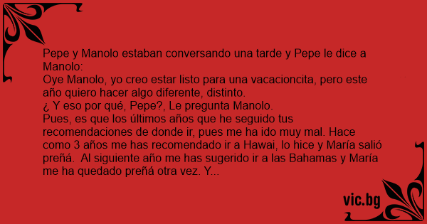 Pues, es que los últimos años que he seguido tus recomendaciones de donde ir, pues me ha ido muy mal. Hace como 3 años me has recomendado ir a Hawai, lo hice y María salió preñá. Al siguiente año me has sugerido ir a las Bahamas y María me ha quedado preñá otra vez. Y como si eso no hubiera sido suficiente, el año pasado me habéis dicho ir a Barbados, y por supuesto, María volvió a salir preñá, replicó Pepe.