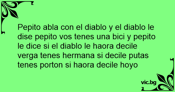 Pepito abla соn el diablo y el diablo le dise pepito vos tenes una bici y pepito le dice si el diablo le haora decile vеrgа tenes hermana si decile putas tenes porton si haora decile hoyo