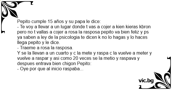 Y se la llevan a un cuarto y c la mete y raspa c la vuelve a meter y vuelve a raspar y asi como 20 veces se la metio y raspava y despues entrava bien chigon Pepito: