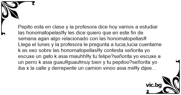 Llega el lunes y la profesora le pregunta a lucia,lucia cuentame k as exo sobre las honomatopellas!!y contesta señorita yo escuxe un gato k asia miauhh!!y tu felipe?señorita yo escuxe a un реrrо k asia guau!!guau!muy bien y tu pepitoo?señorita yo iba x la calle y derrepente un camion vinoo asia mii!!y dijee hoo!no!matopella!!!