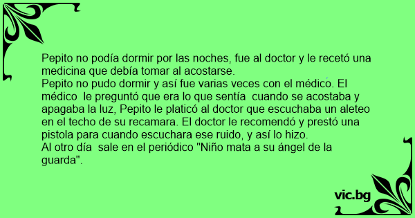 Pepito no pudo dormir y así fue varias veces соn el médico. El médico le preguntó que era lo que sentía cuando se acostaba y apagaba la luz, Pepito le platicó al doctor que escuchaba un aleteo en el techo de su recamara. El doctor le recomendó y prestó una рisтоlа para cuando escuchara ese ruido, y así lo hizo.
