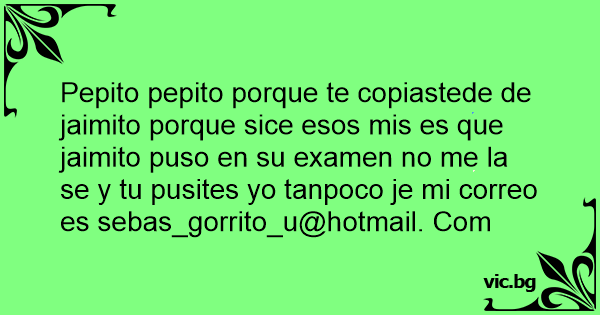 Pepito pepito porque te copiastede de jaimito porque sice esos mis es que jaimito puso en su examen no me la se y tu pusites yo tanpoco je mi correo es sebas_gorrito_u@hotmail. Com