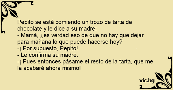 Pepito se está comiendo un trozo de tarta de chocolate y le dice a su madre: