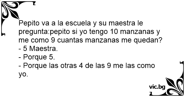 Pepito va a la escuela y su maestra le pregunta:pepito si yo tengo 10 manzanas y me como 9 cuantas manzanas me quedan?
