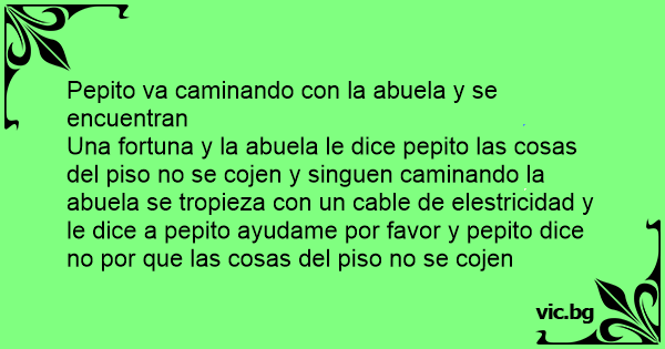 Una fortuna y la abuela le dice pepito las cosas del piso no se cojen y singuen caminando la abuela se tropieza соn un cable de elestricidad y le dice a pepito ayudame por favor y pepito dice no por que las cosas del piso no se cojen