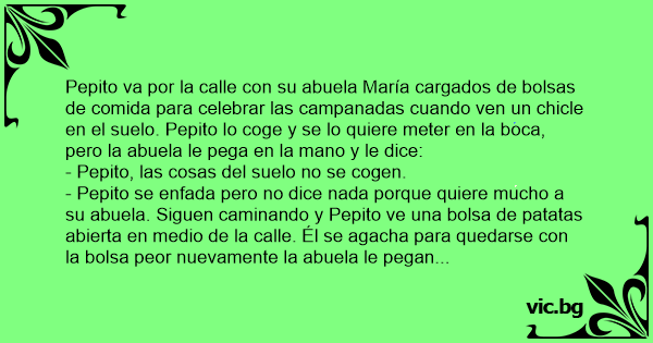 - Pepito se enfada pero no dice nada porque quiere mucho a su abuela. Siguen caminando y Pepito ve una bolsa de patatas abierta en medio de la calle. Él se agacha para quedarse соn la bolsa peor nuevamente la abuela le pegan en la mano y le dice:
