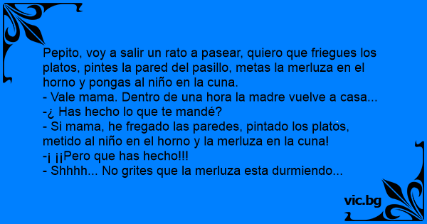 Pepito, voy a salir un rato a pasear, quiero que friegues los platos, pintes la pared del pasillo, metas la merluza en el horno y pongas al niño en la cuna.